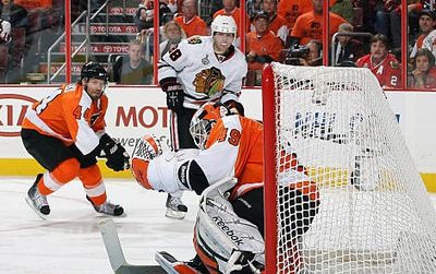 In the most Flyer way to possibly lose the Stanley Cup and see your opponent celebrate on your home ice, Michael Leighton let an epically weak, bad-angle shot by Patrick Kane go right through him for the winning (losing) goal. Kane himself was the only person who even realized that the shot had gone in within ten seconds of the play happening.